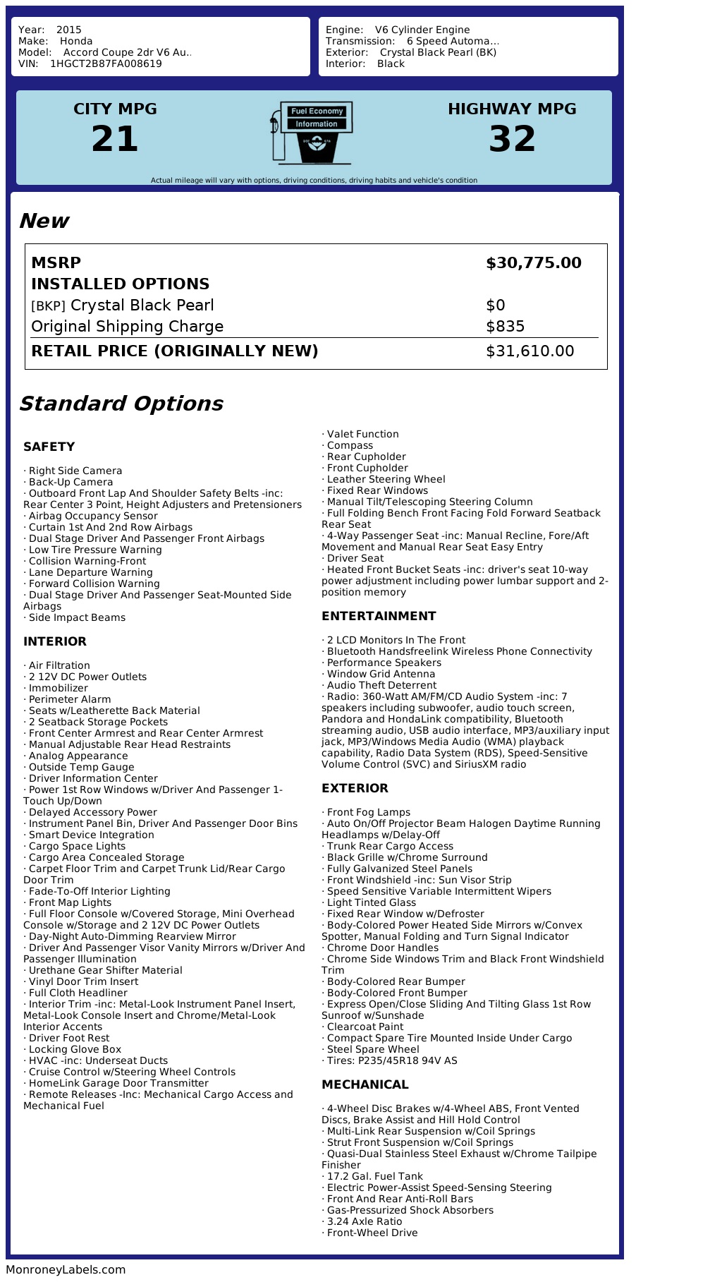 The exterior of this Accord Coupe is a head-turner, with its clearcoat black paint and chrome accents. The 18-inch tires give it a sporty look, while the express open/close sunroof lets you soak up the sun on those beautiful days. The automatic projector beam halogen headlamps light up the road ahead, while the fog lamps add visibility in inclement weather.